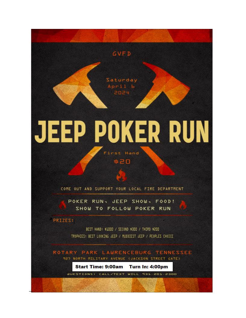 2024 Jeep Poker Run Come on out for a day of fun and help support your local Volunteer Fire Department. Will have food vendors on site. All Poker Stops will be local in Lawrence County. Rules/Stops will be posted closer to date. Jeep show to follow.