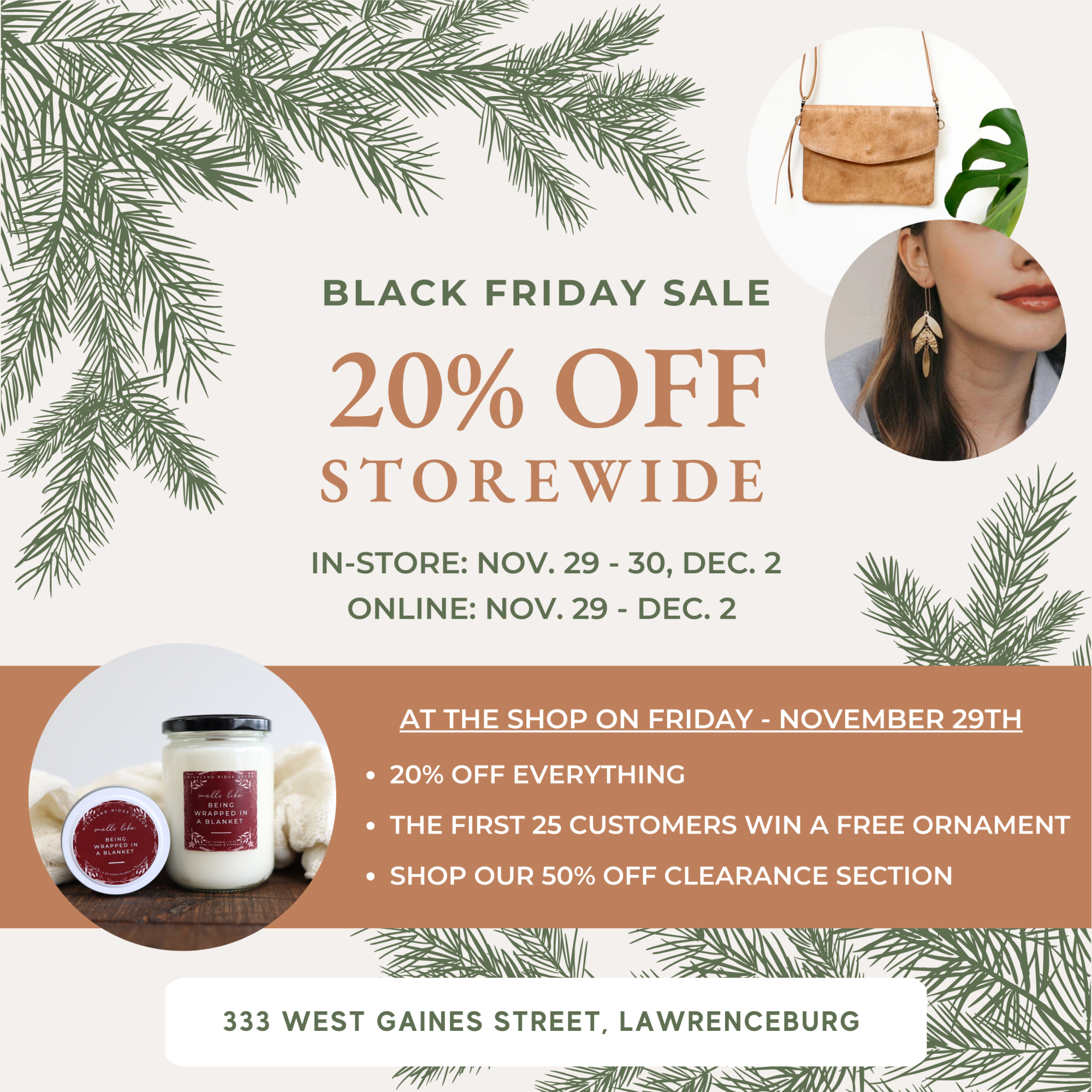 The entire store will be 20% off and the first 25 customers will win a free Christmas ornament! We will also have a 50% off clearance section available to shop.